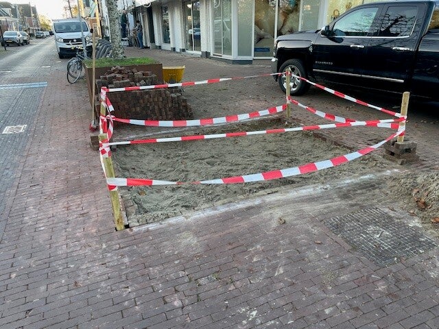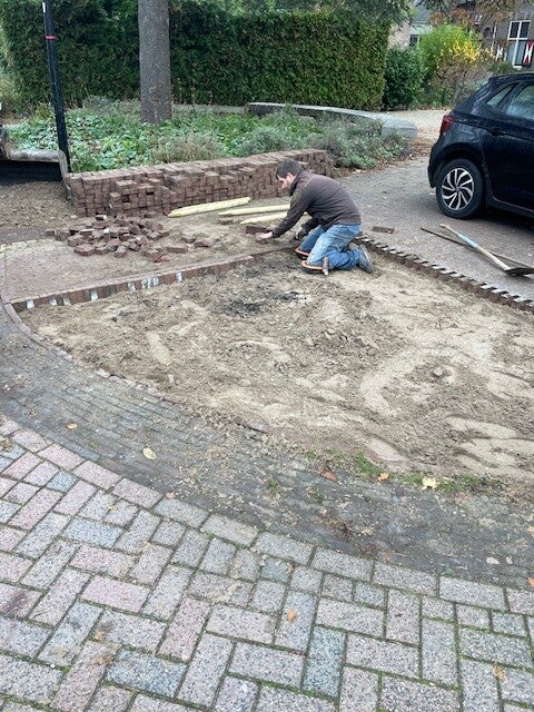 september 2019: Het perkje rond de plataan krijgt een opknapbeurt.
